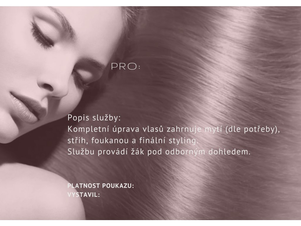 Poukaz na dámskou úpravu vlasů (dle potřeby) - mytí, střih, foukanou a finální styling (Žák)
