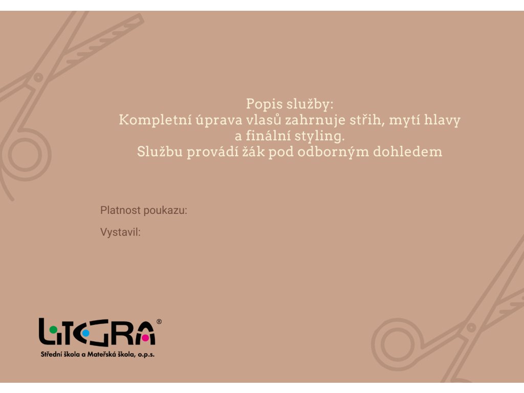Kompletní úprava vlasů zahrnuje střih, mytí hlavy a finální styling. Službu prování žák pod odborným dohledem.